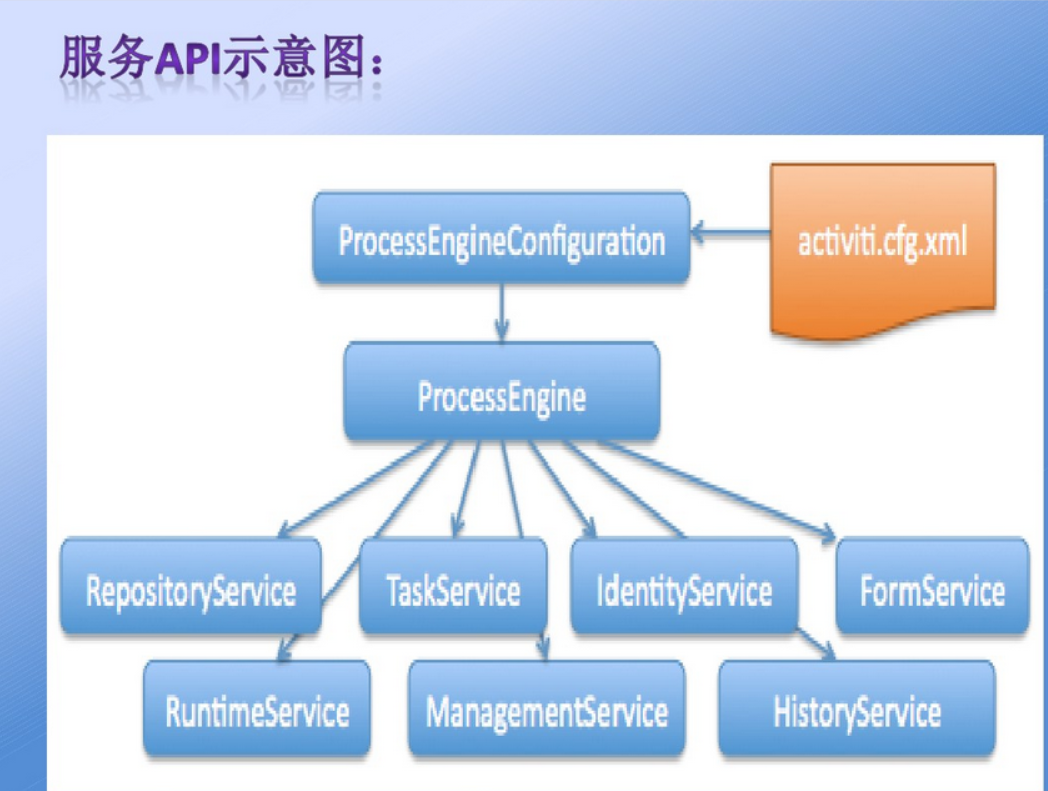 ProcessEngine:在Activiti中最核心的类,其他的类都是由他而来,定义了各种服务类实例对象方法