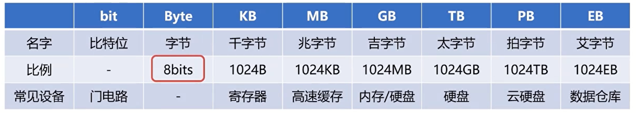 在计算机的物理层面,用高低电平记录信息,高电平代表1,低电平代表0,计算机只认识0和1两种状态,这里的0或1我们就称为一个bit(比特位),但是0/1能够表示的内容太少了,需要更大的容量表示方法,因此人们用8个比特位来表示一个字节(byte),一个字节等于八个比特位。随着计算机的发展,存储容量越来越大,用字节来表示容量也显得很不方便了,于是,出现了更高的容量单位。