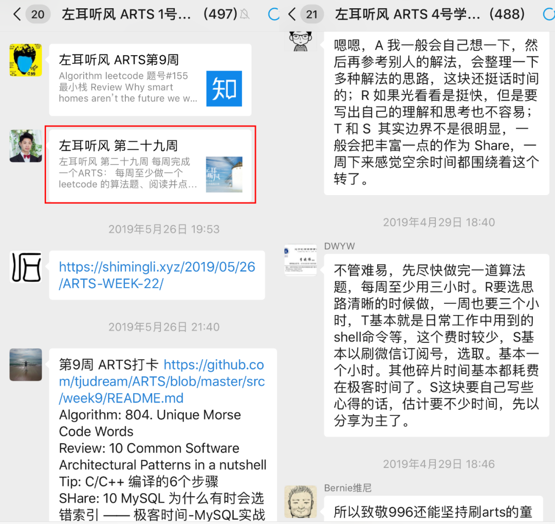 之前耗子叔组过 7 个群,有 3500 多人加入,群里汇聚了前端、后端、大数据、人工智能等各个领域的程序员,有学生也有创业者,经常一起讨论干货,交流技术,互相监督,学习成长。在群里让大家进行ARTS 打卡,也就是每周的定期输出和总结。