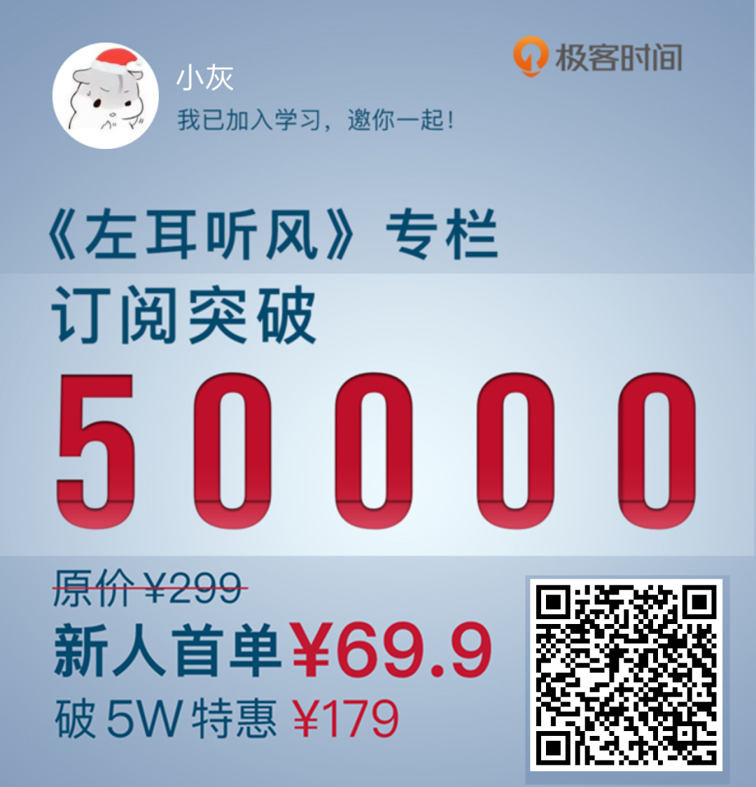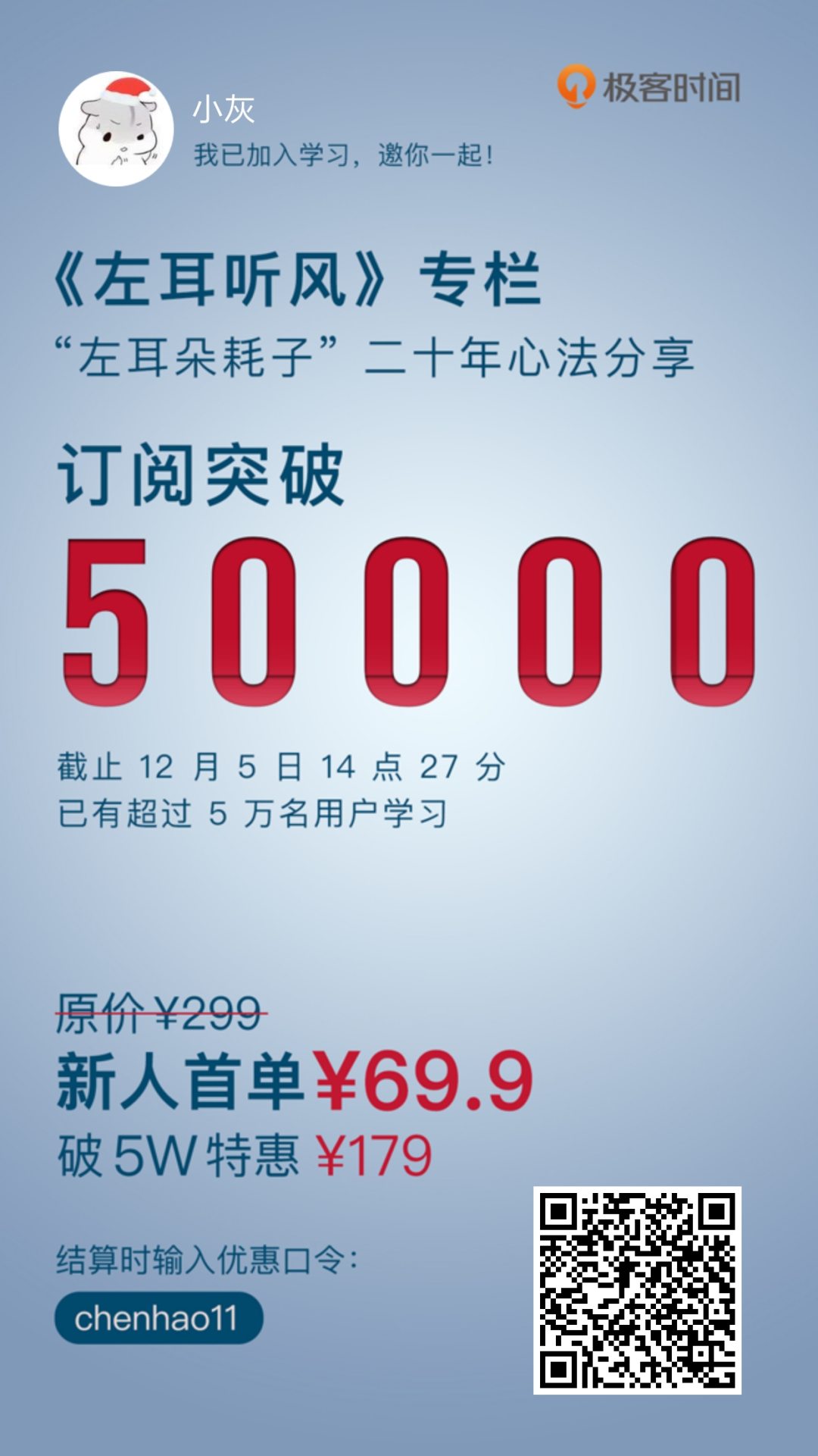 作为一个愿意分享的技术人,耗子叔在极客时间撰写了全年大专栏《左耳听风》,其内容覆盖了大部分技术领域,分布式、编程范式、容器技术、AI、区块链、程序员练级、高效管理等等,可以说是程序员必备宝典,他 20 年技术经验和学习总结,都在这里了。最近这门课程的订阅量已经突破 50000 了哦(敲黑板)。