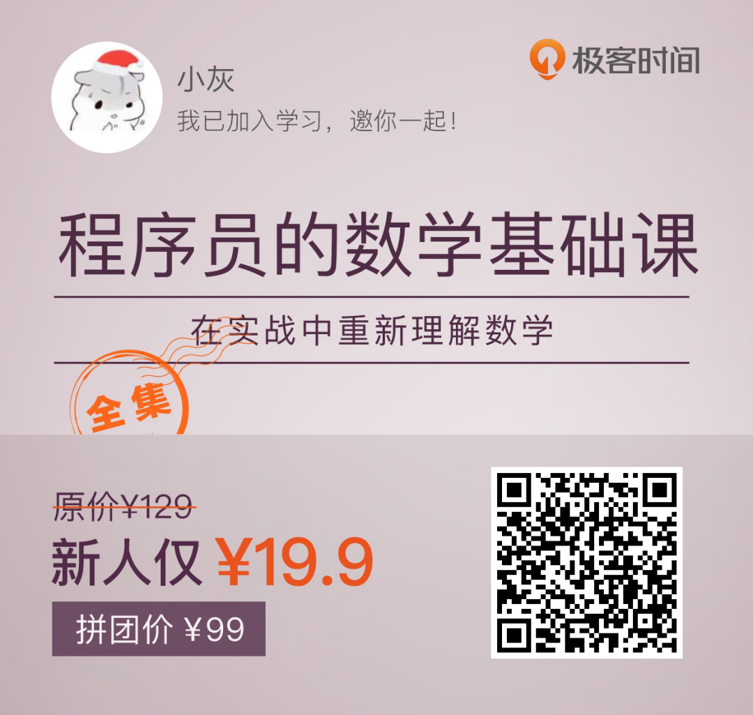 最后,小灰再给大家推荐一门数学课。数学基础的好坏,会直接决定一个程序员的发展潜力。很多大公司在招人时,都会优先考虑数学专业的毕业生。LinkedIn 资深数据科学家黄申,为你精讲程序员真正用得上的数学知识。超过 3 万人已加入学习,是极客时间最火爆的基础课程。专栏图文并茂,老师不仅会回答问题,还会在每一章节末尾总结「学习笔记」,可以保存下来随时复习。算法学不好?或许你该补补数学了。