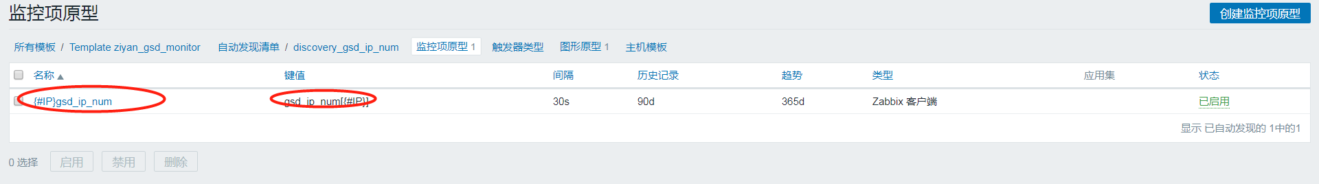 注意,这是在模板的自动发现规则里面的监控项原型定义的监控项 并不是 模板里面的监控项 两者是不同的,当你把监控项原型定义之后,他会自动发现里面的规则,然后帮助我们自动在监控项里面添加