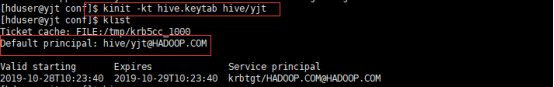 # kinit -kt /data1/hadoop/hive/conf/hive.keytab hive/yjt
