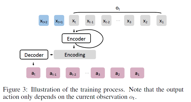 我们有nt轨道,每个轨道由n对 观测-动作 对组成。该数据集有n x nt样本,这可能非常大,会使训练速度变慢。事实上。来自同一轨迹的观测高度相关,即, ot+l与ot的唯一区别是ot+1多了一个观测点t+1;因此,递归神经网络将会有大量的重复计算(例如编码器)。为了加快训练速度,我们应该从同一个轨道中训练一批观测-动作对,在将输入Ot输入到g中得到at后,我们没有将新的输入Ot +1输入到g中,而是将xt+1输入到g中,得到g在at+1时的输出。图3演示了这个训练过程。
