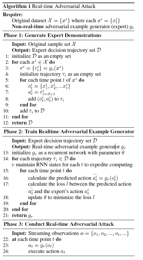 值得一提的是,尽管在本文中,为了简单起见,我们主要关注使用基本的行为克隆算法,有许多更高级的算法(e.g., Dataset Aggregation[Ross et al., 2011])在模仿学习和控制一定的学习,可以进一步提高攻击结构,例如,可以设计一个补救机制实时对抗扰动个发生器,如果它意识到它曾犯了一个错误的决定 ,允许其调整其未来战略。因此,将实时攻击形式化为增强学习问题不仅是自然的,而且允许我们应用现有的工具和算法。