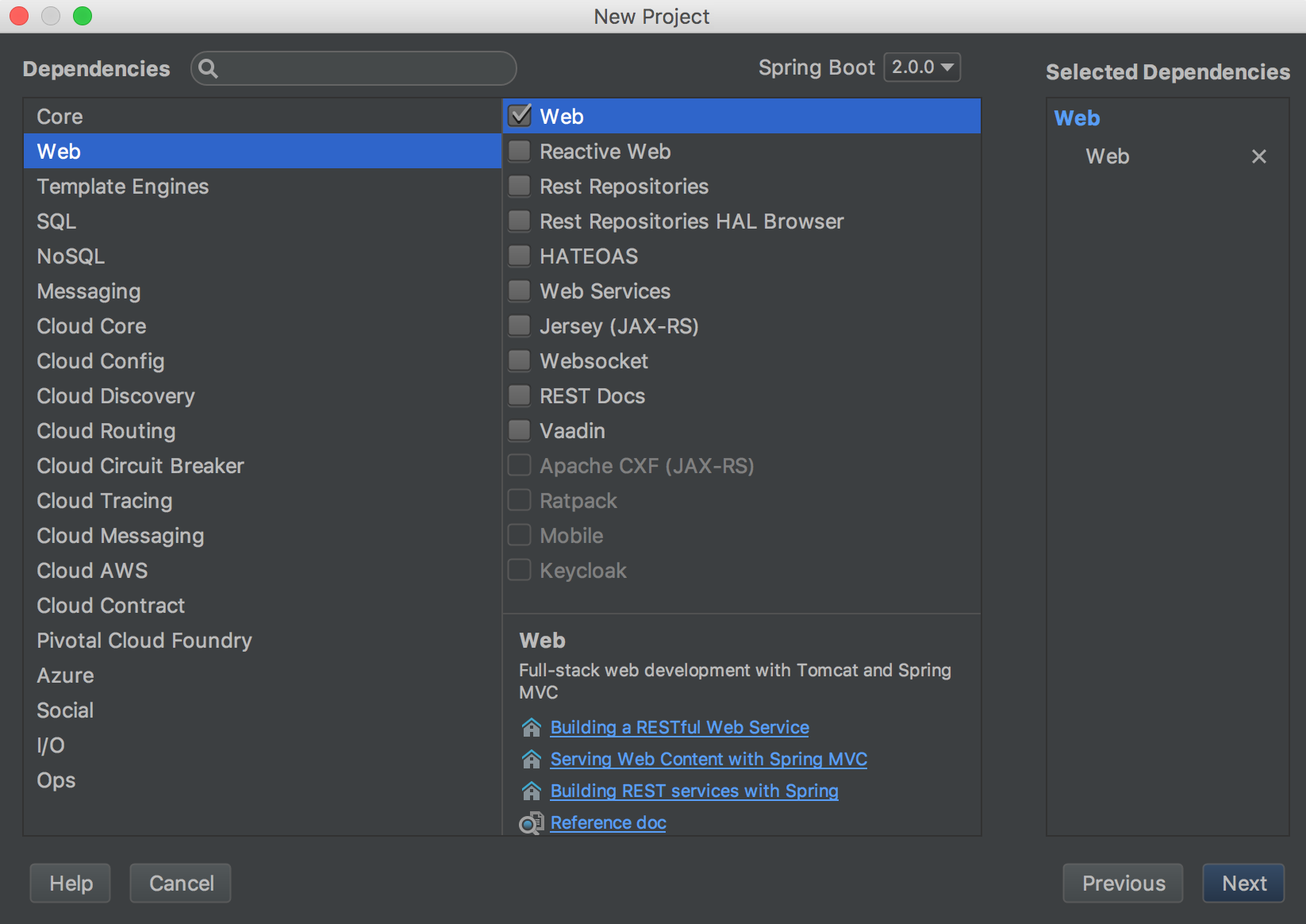 点击 Next 后,选择 Spring Boot 版本,并勾选 Web 选项,如图: