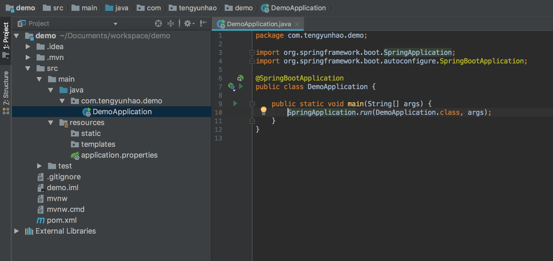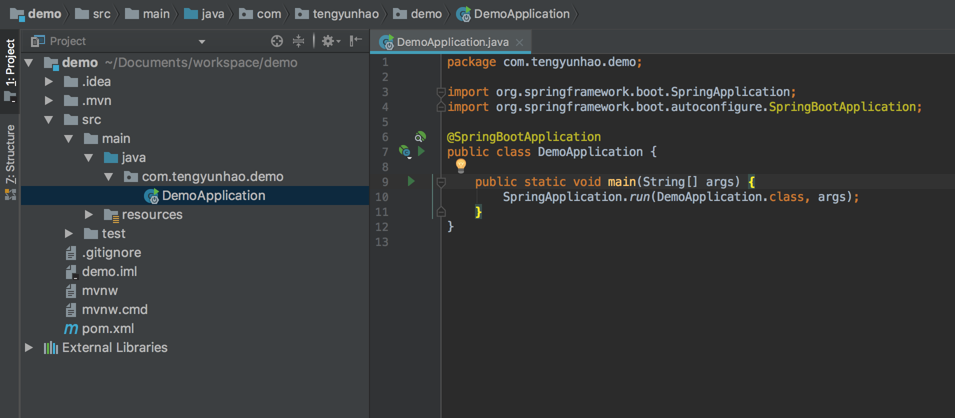 我们创建一个 Spring Boot 项目后会自动生成一个入口类,入口类中包含一个 main 方法,通过这个我们来启动 Web 项目,如图: