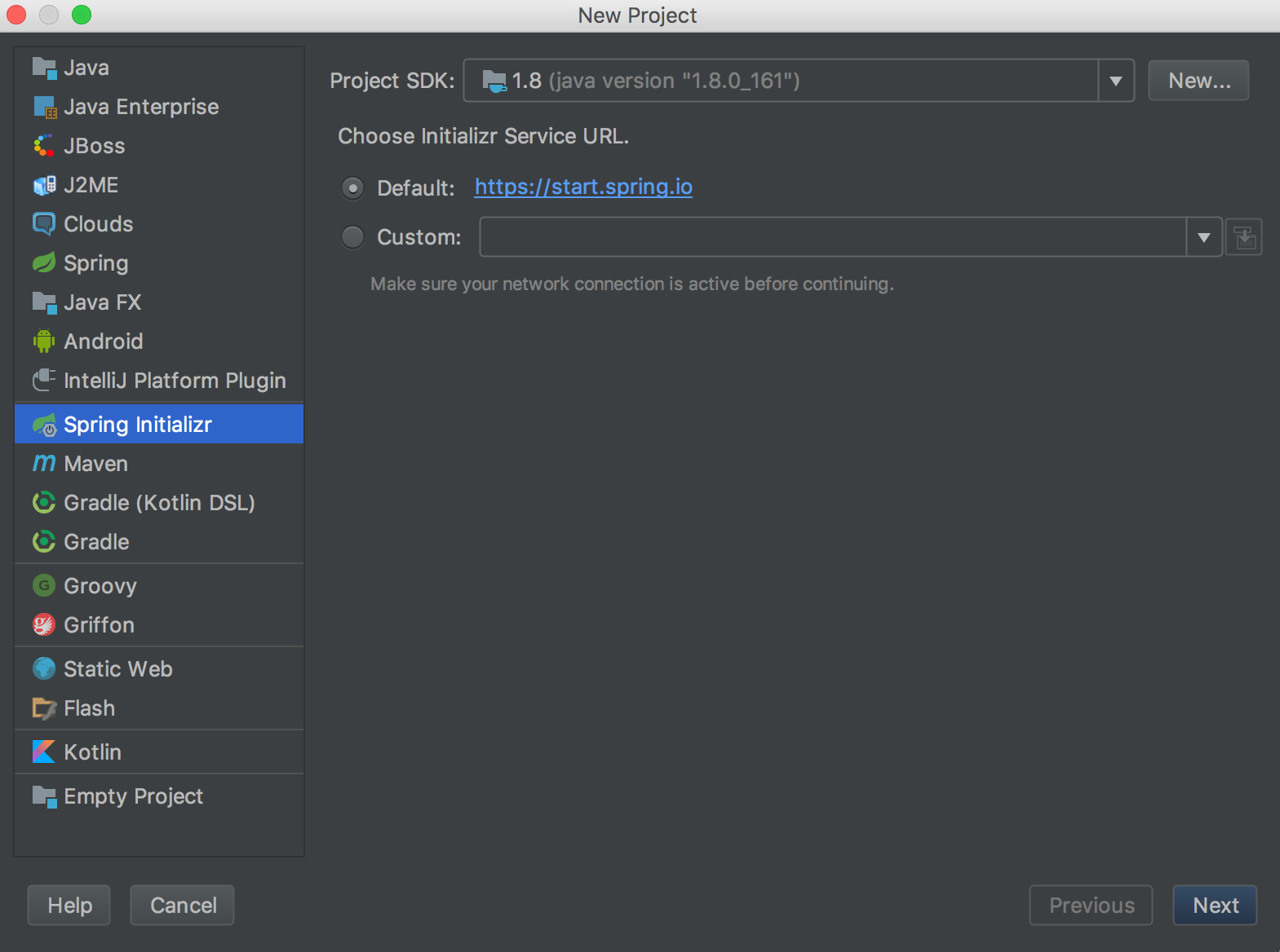 首先使用 IntelliJ IDEA 创建一个项目,选择 Spring Initializr,如图: