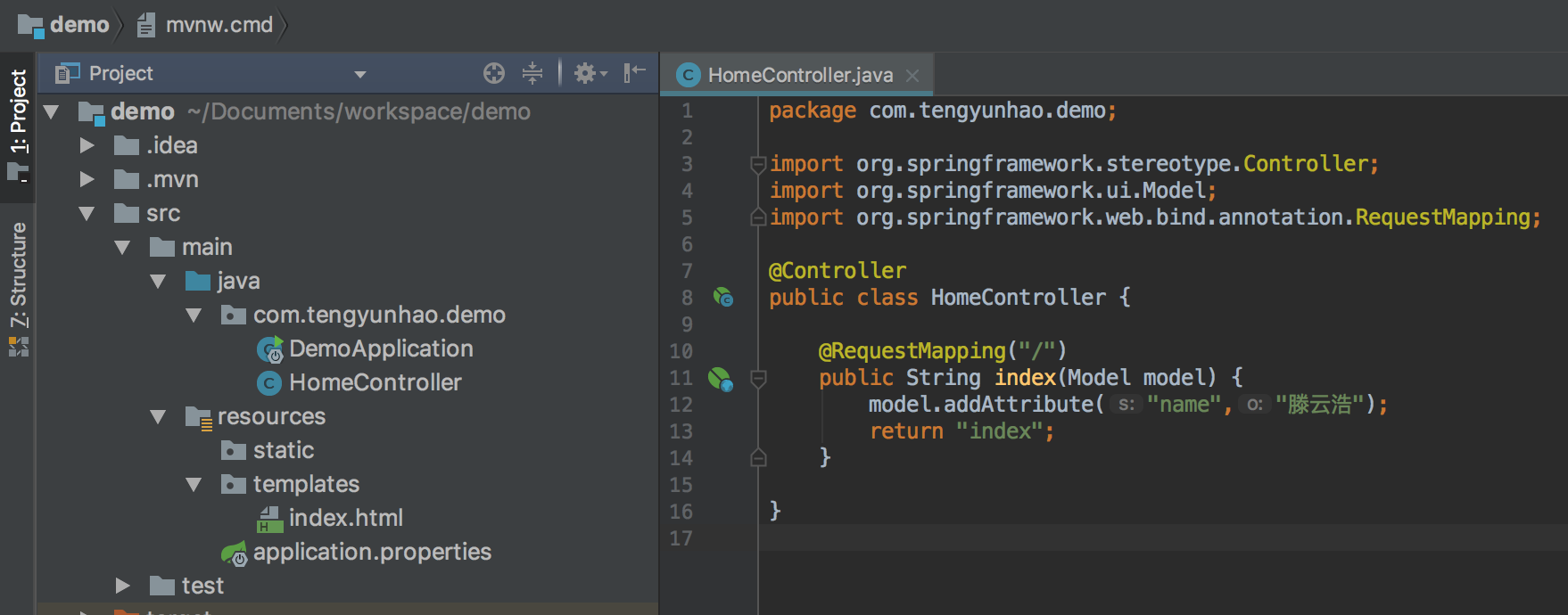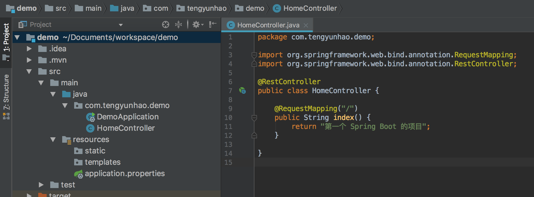 修改 HomeController 的代码,将 @RestController 注解换为 @Controller 注解 (@RestController = @Controller + @ResponseBody),如图: