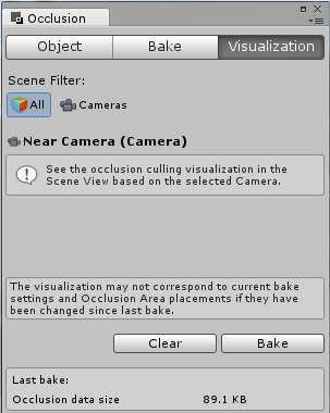 Visualization :形象化。在测遮挡剔除效果时选择此项(需要选择一个摄像机)