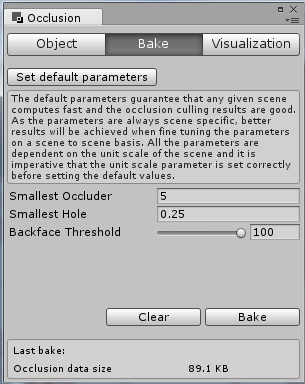 将需要自动遮挡的对象勾选 为Occluder Static/Occludee Static,然后在 Occlusion 中进行简单的设置 Bake 即可。最后可以在 Visualization 模式下进行测试。