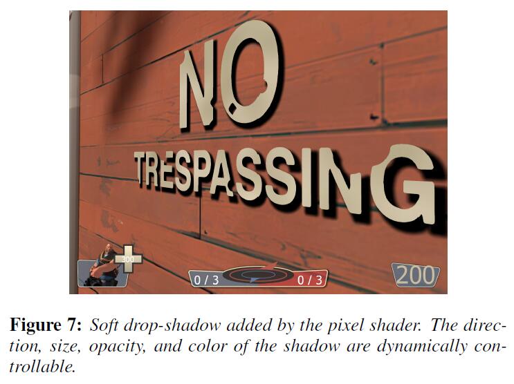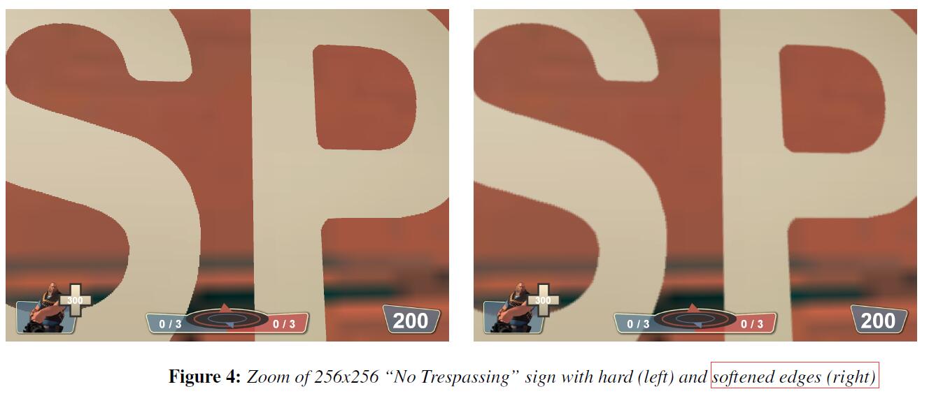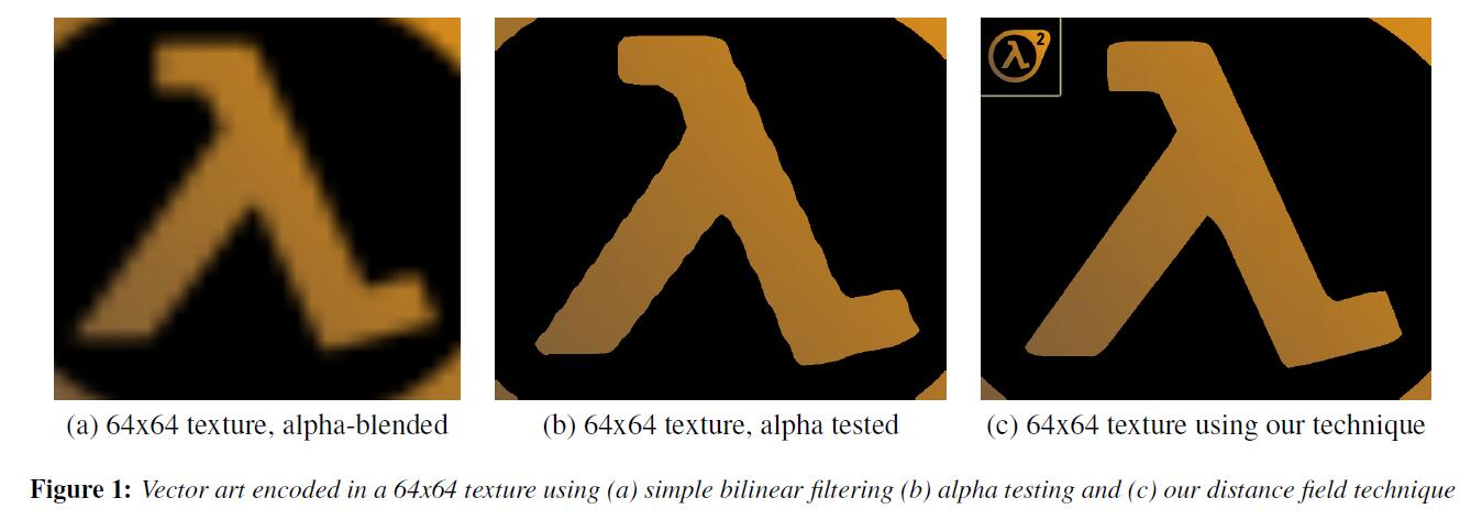 A distance field is generated from a high resolution image, and then stored into a channel of a lower-resolution texture. which has been previously used to develop games such as the Half-Life 2 series, Counter-Strike: Source and Day of Defeat: Source.