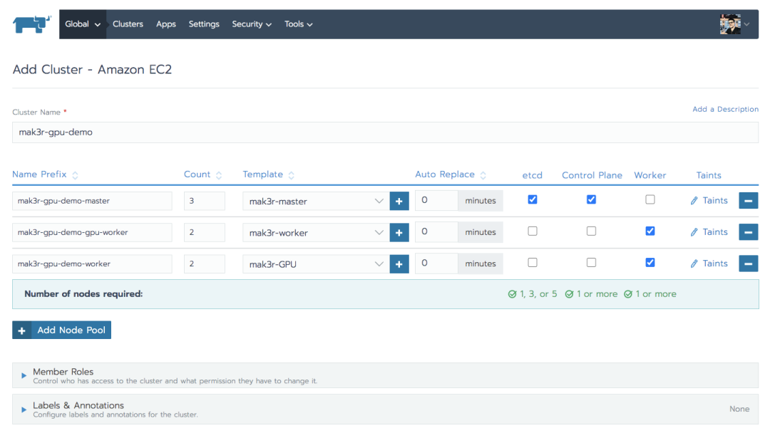注意到这里有3个节点池:一个是为master准备的,一个是为标准的worker节点准备的,另一个是为带GPU的worker准备的。GPU的模板基于p3.2xlarge机器类型,使用Ubuntu 18.04亚马逊机器镜像或AMI(ami-0ac80df6eff0e70b5)。当然,这些选择是根据每个基础设施提供商和企业需求而变化的。另外,我们将 “Add Cluster”表单中的Kubernetes选项设置为默认值。