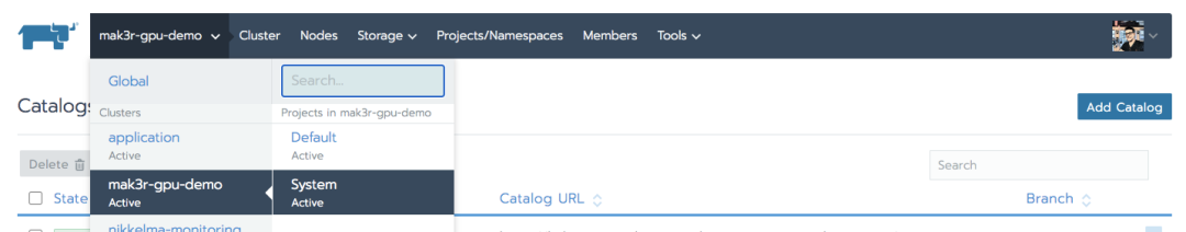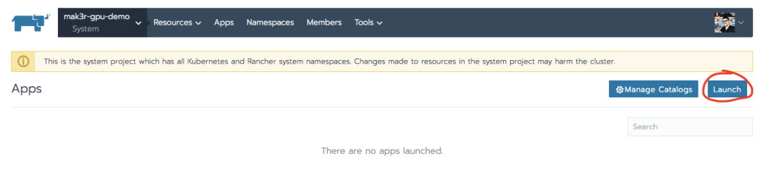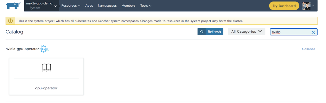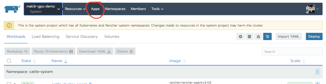现在我们想要使用左上角的Rancher上下文菜单以进入集群的“System”项目,我们在这里添加了GPU Operator功能。