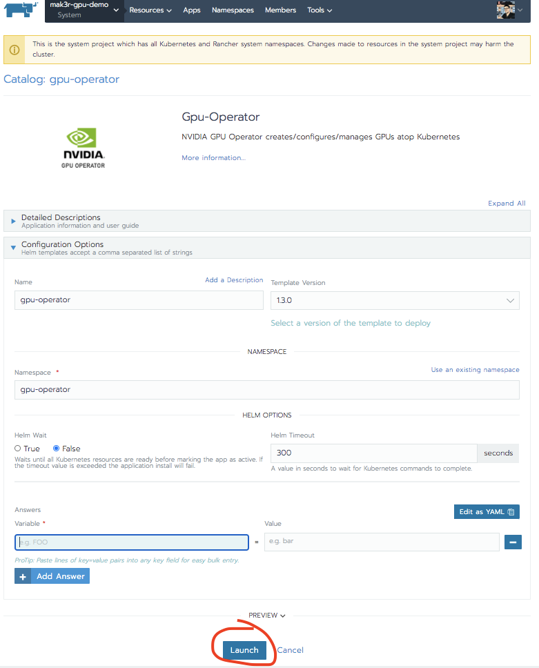 现在,我们将使用GPU Operator库(https://nvidia.github.io/gpu-operator)在Rancher中设置一个catalog。(也有其他的解决方案可以暴露GPU,包括使用Linux for Tegra [L4T] Linux发行版或设备插件)在撰写本文时,GPU Operator已经通过NVIDIA Tesla Driver 440进行了测试和验证。