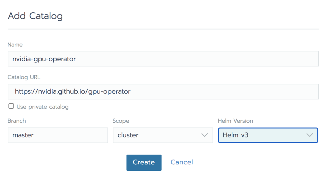 我们选择了Helm v3和集群范围。我们点击Create以添加Catalog到Rancher。当使用自动化时,我们可以将这一步作为集群构建的一部分。根据企业策略,我们可以添加这个Catalog到每个集群中,即使它还没有GPU节点或节点池。这一步为我们提供了访问GPU Operator chart的机会,我们接下来将安装它。