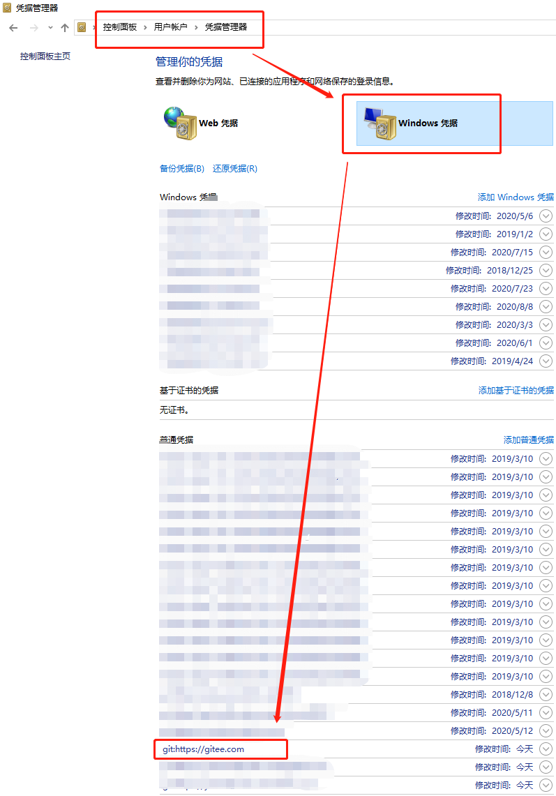 打开 【控制面板】->【用户账号】->【凭据管理器】->【Windows 凭据】,在普通凭据里可以直接新增账号或者找到相关git网站修改账号/密码,比如gitee 来源:oschina链接:https://my.oschina.net/pipimao/blog/4868926 标签 git Gitee