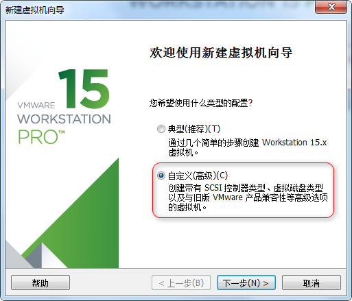 2、选择“自定义(高级)”选项,下一步,默认“虚拟机硬件兼容性”或选择低版本,下一步。