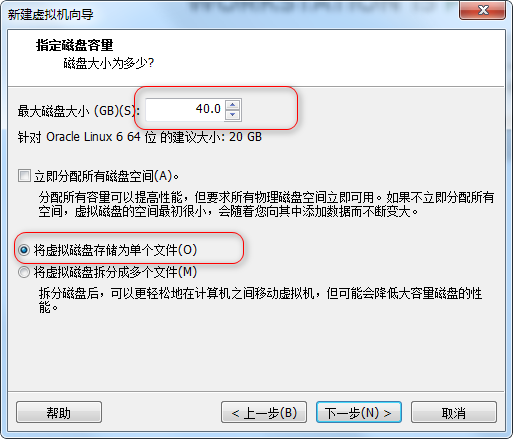 7、设置最大磁盘大小为40.0G,将虚拟磁盘存储为单个文件,下一步,默认设置,下一步。