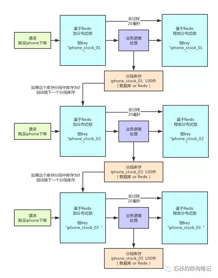 其实这就是分段加锁。你想,假如你现在iphone有1000个库存,那么你完全可以给拆成20个库存段,要是你愿意,可以在数据库的表里建20个库存字段,比如stock_01,stock_02,类似这样的,也可以在redis之类的地方放20个库存key。