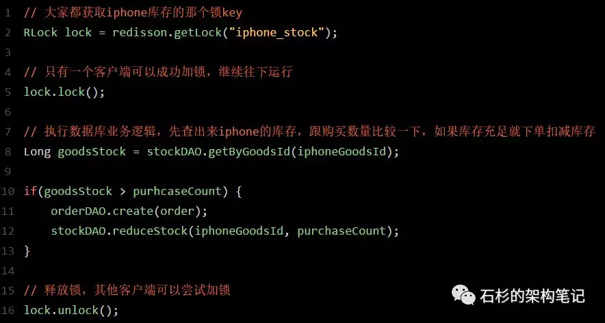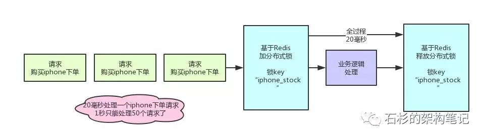比如,对iphone这个商品的下单,都必对“iphone_stock”这个锁key来加锁。这样会导致对同一个商品的下单请求,就必须串行化,一个接一个的处理。
