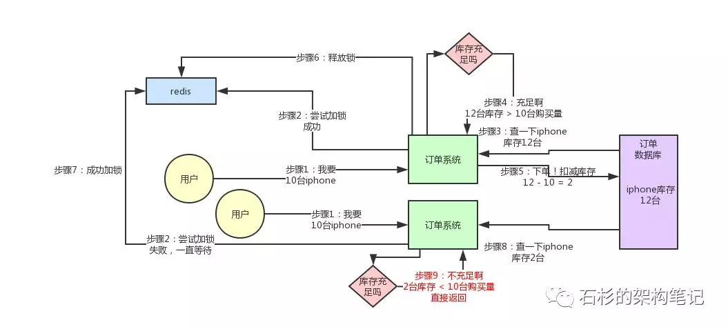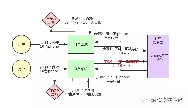这个图,其实很清晰了,假设订单系统部署两台机器上,不同的用户都要同时买10台iphone,分别发了一个请求给订单系统。