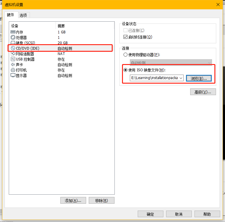 选择IDE,选择使用ISO映像文件,添加下载的centos7 镜像,选择启动时连接,点击确定;