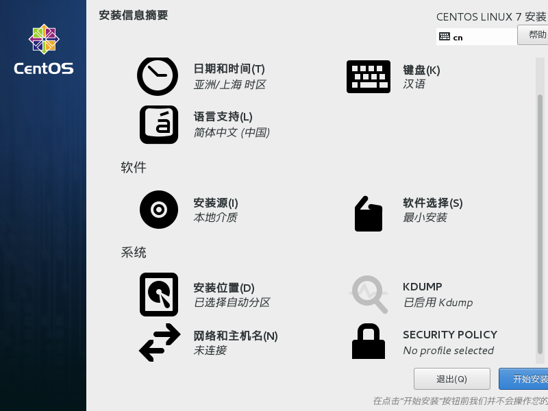 安装选项设置,点击相应的图标设置相关选项,选择时区、语言、最小化安装,点击开始安装。软件选择推荐使用最小化安装,占用内存小,且符合企业的工作习惯;