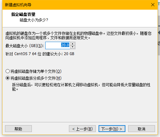指定磁盘容量,选择默认模式,点击下一步,此处的最大磁盘大小并不指虚拟机centos7占用真实的磁盘大小,用多少算多少;此处推荐大家选择将虚拟磁盘存储为单个文件;