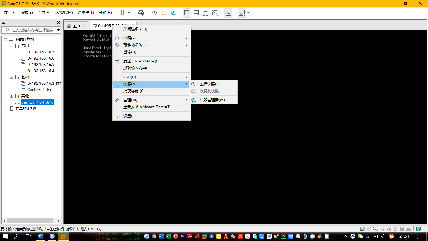 快照 右击你的虚拟机,有个快照选项,点击快照选项可以拍摄快照,快照会记录你虚拟机当前的状态,当你的虚拟机出现问题时可以通过恢复快照恢复到当前状态。