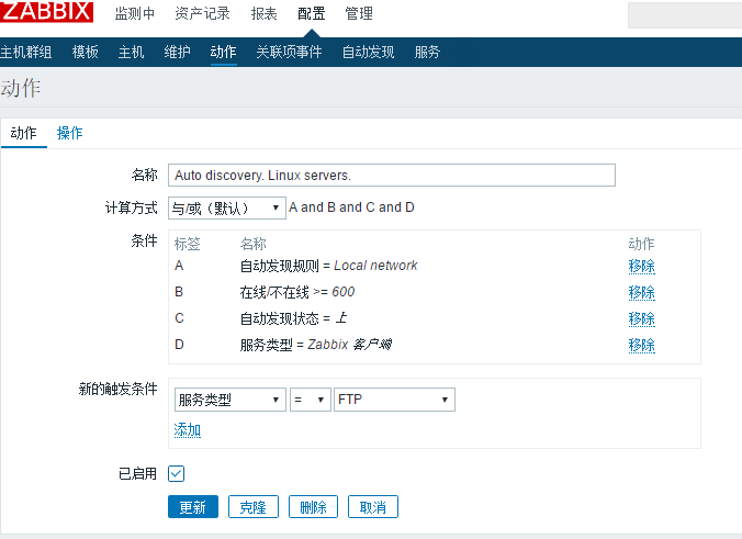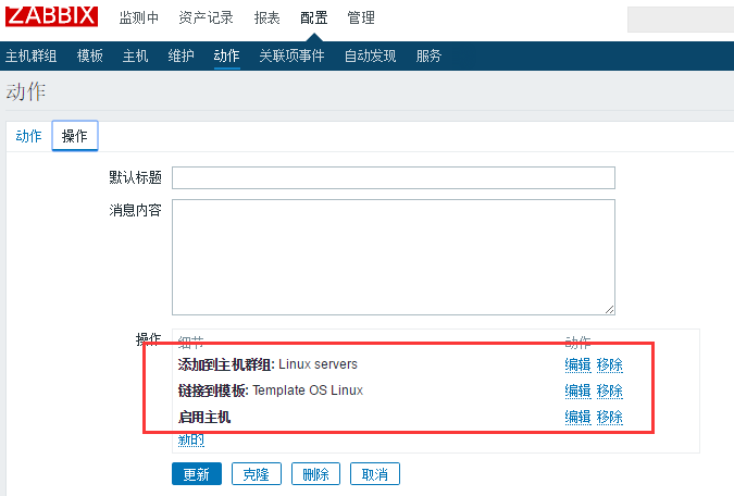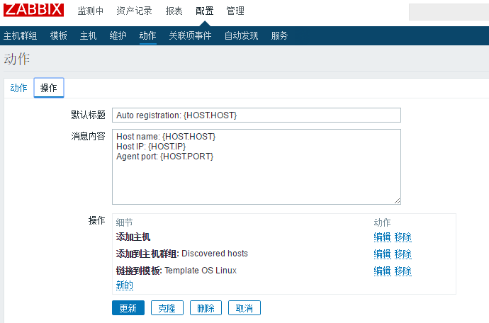 动作是对发现的主机进程相关的设置过程, 常用的动作有添加,或删除主机,启用或停用主机,添加主机到某一个组中,发现通知等等.