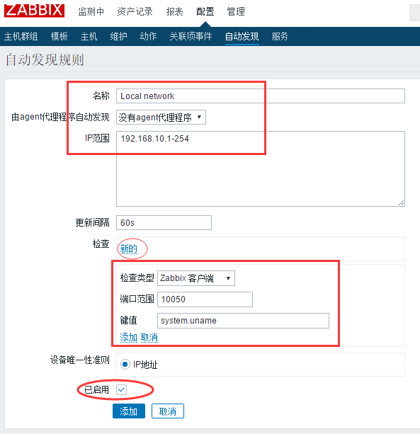 zabbix周期性地扫描在网络发现规则中定义的IP段,根据每一个规则配置自身的检查频率,每一个规则都定义了一个对指定IP段的服务检查集合.