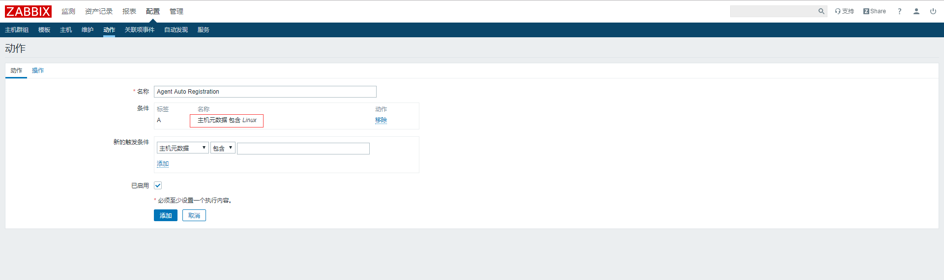 说明:页面操作是主机元数据的值, uname可以查看到系统,zabbix服务端通过 system.uname判断是否与配置的触发条件吻合