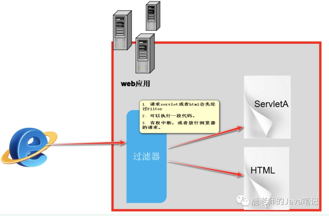 过滤器filter的概念:Servlet中提供的技术,可以过滤浏览器发出的请求,并且决定放行请求还是中断请求。
