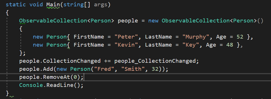 7)ObservableCollection<T>类表示能在添加、移除或者刷新整个列表时提供通知的动态数据集,合,ReadOnlyObservableCollection<T>的操作与之类似,不过是只读的。ObservableCollection《T>实现了一个名为CollectionChanged事件,该事件在插入新的数据或者移除数据时触发。