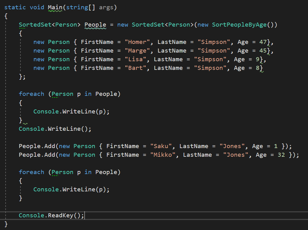 6)SortedSet<T>类,这个类中的数据是排序的,在插入和移除数据之后仍然能自动排序,需要向其构造函数中传递一个实现了IComparer<T>,该接口定义了Compare方法。