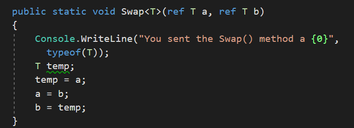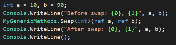 8)除了使用命名空间内包含的泛型类型后,也可以自定义泛型方法,以下定义了一个交换的泛型方法。