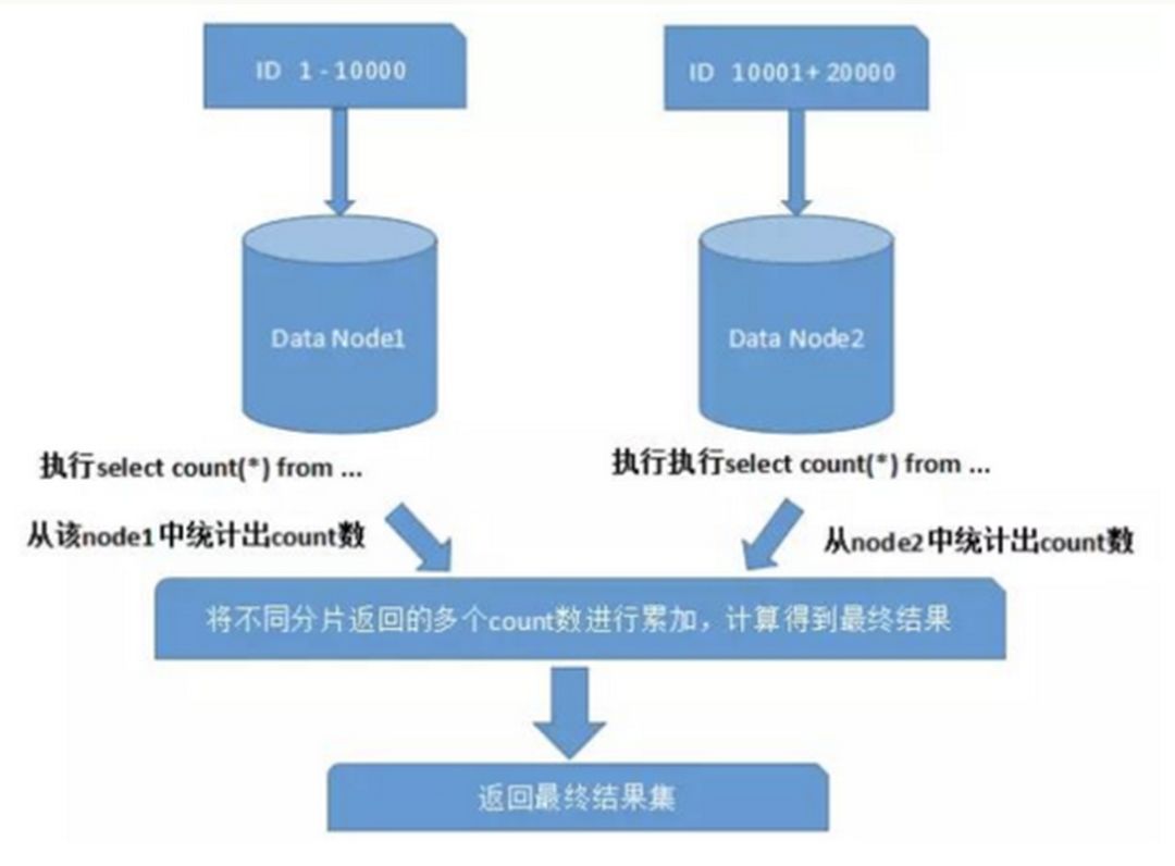 在使用Max、Min、Sum、Count之类的函数进行计算的时候,也需要先在每个分片上执行相应的函数,然后将各个分片的结果集进行汇总和再次计算,最终将结果返回。如图所示: