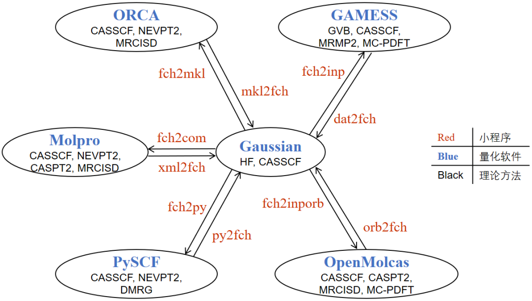 这些小程序考虑了各个量化程序的基函数的顺序问题(最高到H角动量)、重叠积分问题等等,可以十分精确地在各个量化程序间传轨道,两个程序中同一个波函数方法(例如R(O)HF、UHF、CASSCF等)的电子能量相差小于10-6 a.u.,传轨道过去后通常1圈即收敛。