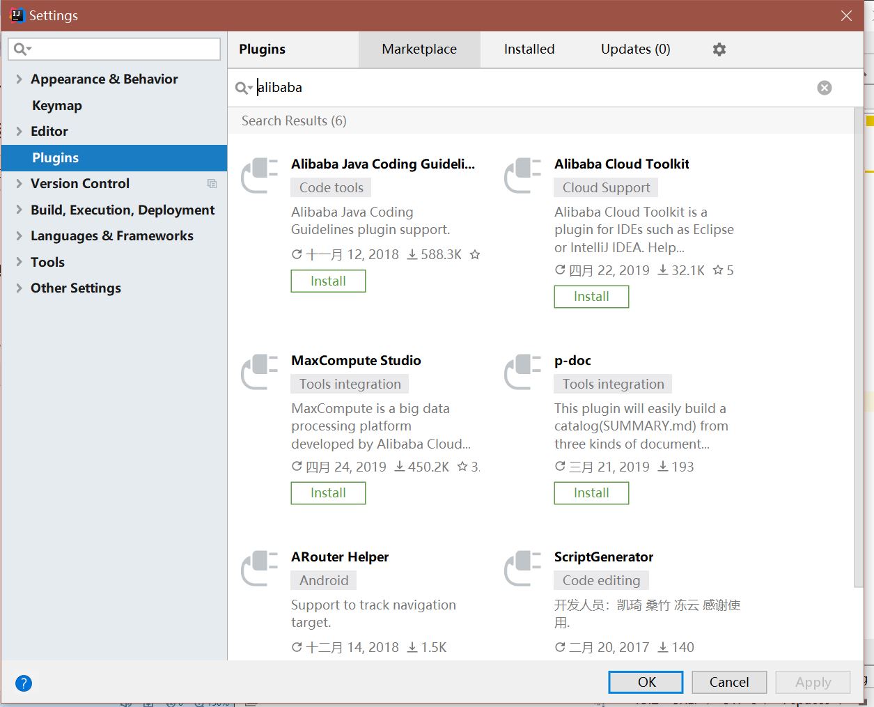 Settings->Plugins->Marketplace在搜索框输入alibaba即可看到Alibaba Java Code Guidelines插件,点击Install进行安装,然后重启IDE生效: