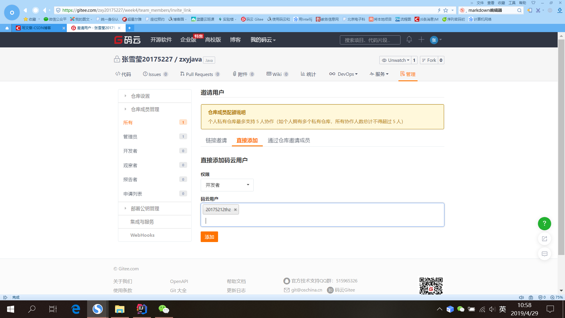 - 本次实验还get了码云仓库新技能,可以在仓库中添加成员,这对于结对编程来说很方便,一定程度上提高了结对编程效率。