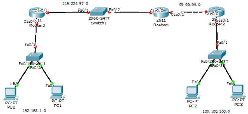 1.条件:如图,PC2、3地址分别为100.100.100.3和100.100.100.4。要求:PC0、1通过R0下发192.168.1.0网段地址并能连接到PC2、3;