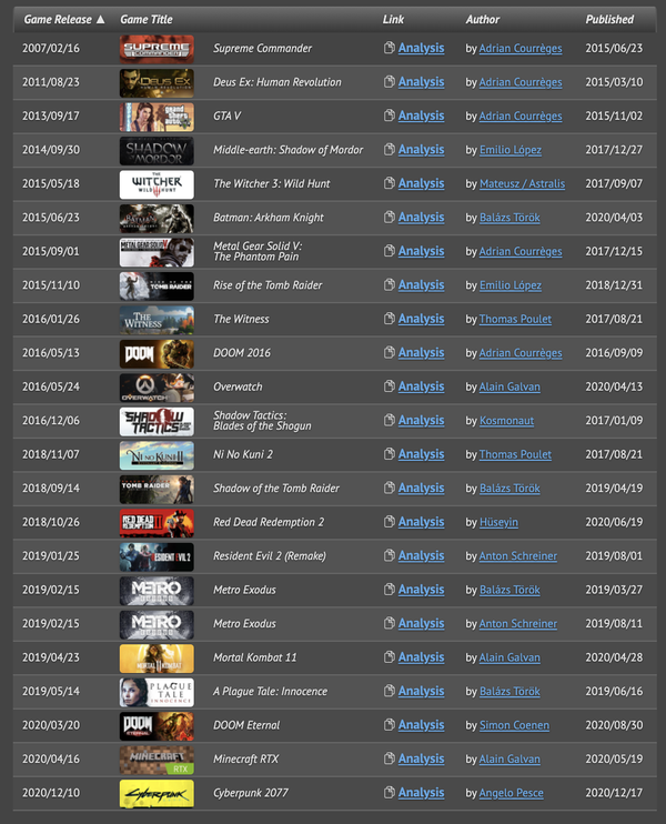 而本文的作者Adrian则整理了从2007/02/16开始到现在的超过20款游戏的图形案例分析,当然作者自己也写了很多高质量的游戏图形分析文章,例如很多人都读过的GTA V - Graphics Study。