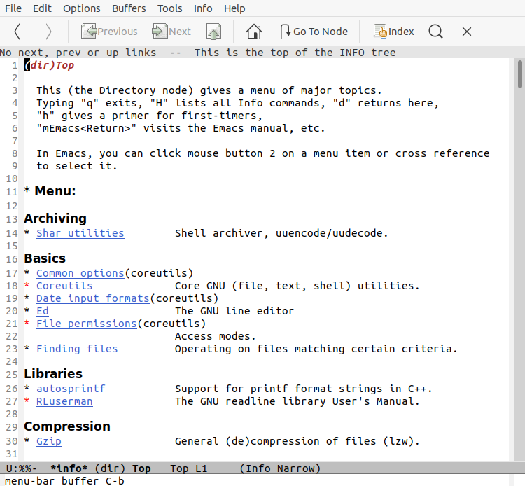 家里电脑(ubuntu20.04)上emacs(26.3)的manual显示不太正常,每次试图打开manual时,总是显示这个,里面只能找到一个Emacs FAQ,并没有多少信息。真不知道TUTORIAL中为什么推荐这个。