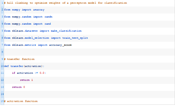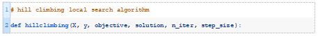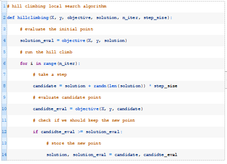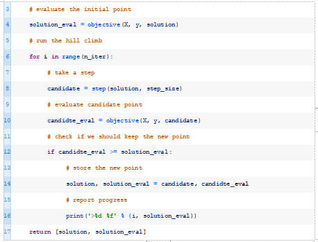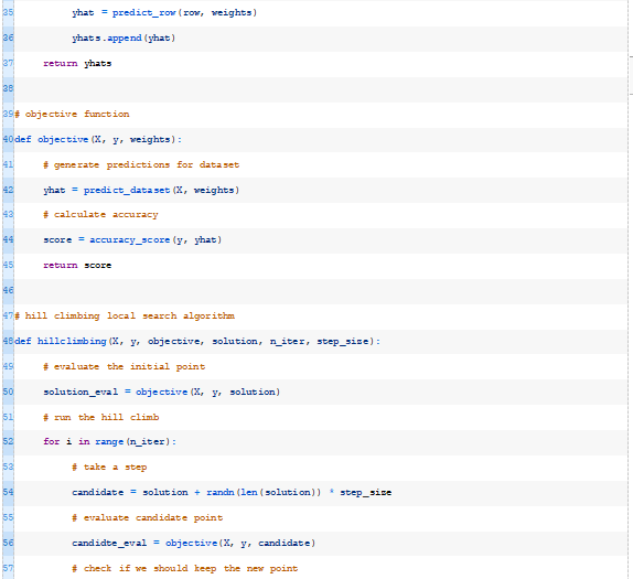 下面的hillclimbing()函数实现了这一点,它将数据集、目标函数、初始解和超参数作为参数,并返回找到的最佳权重集和估计的性能。