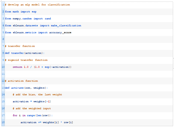 此函数输出0-1之间的实数,表示二项式概率分布(https://machinelearningmastery.com/discrete-probability-distributions-for-machine-learning/),例如一个示例属于1类的概率。下面的transfer()函数实现了这一点。
