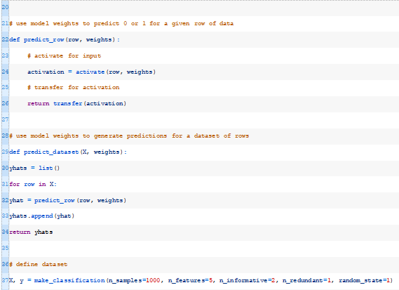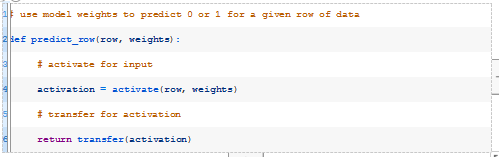 接下来,我们可以一起使用activate()和transfer()函数来生成给定数据行的预测。下面的predict_row()函数实现了这一点。