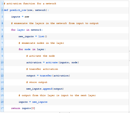 为了计算网络的预测,我们简单地枚举层,然后枚举节点,然后对每个节点的输出进行激活计算和变换。在这种情况下,我们将对网络中的所有节点使用相同的变换函数,尽管这不是必须的。
