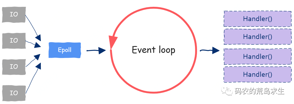 这样IO多路复用技术就成了event loop的原材料供应商,源源不断的给我们提供各种event,这样关于event来源的问题就解决了。