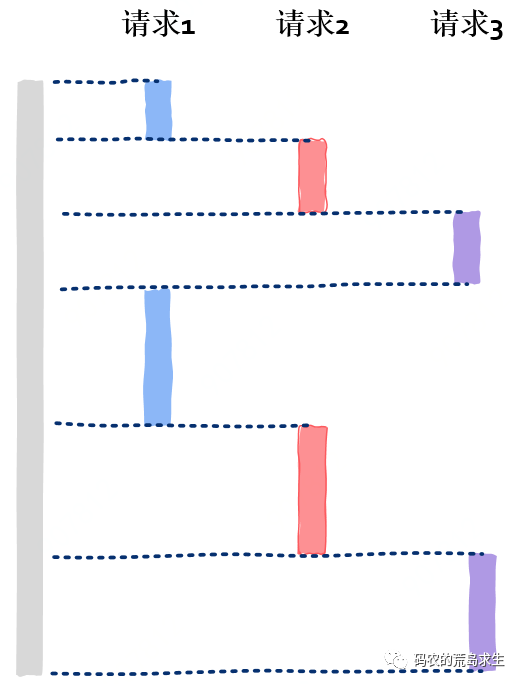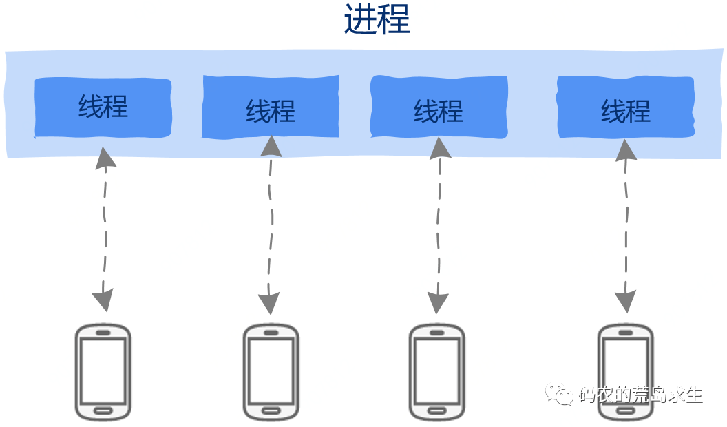 我们可以为每个请求创建一个线程,即使一个线程因执行I/O操作——比如读取数据库等——被阻塞暂停运行也不会影响到其它线程,就像这样: